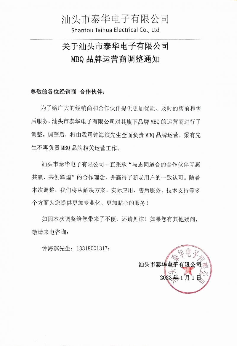 關(guān)于汕頭市泰華電子有限公司MBQ品牌運(yùn)營(yíng)商調(diào)整通知