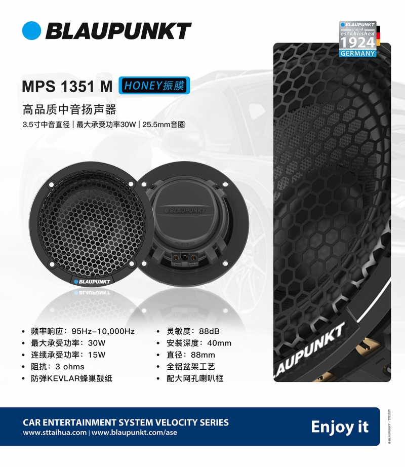 德國(guó)藍(lán)寶奔馳專(zhuān)車(chē)專(zhuān)用中音喇叭採(cǎi)用玻纖音盆,兼具剛性與優(yōu)良的內(nèi)阻尼,失真小。外觀全鋁材質(zhì),背麵是釹鐵硼磁鐵和鋁製音圈,磁性強(qiáng),穩(wěn)定性高。