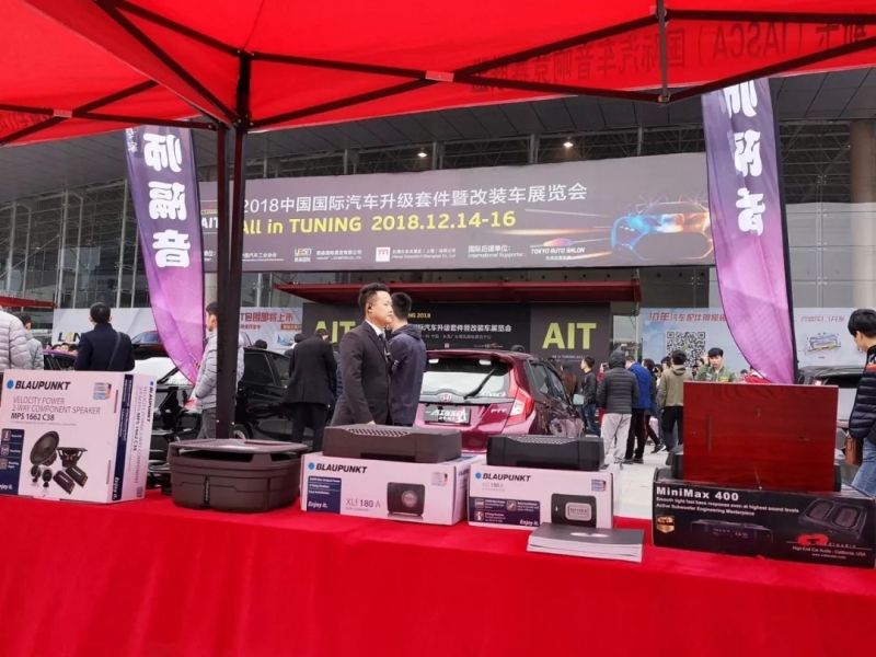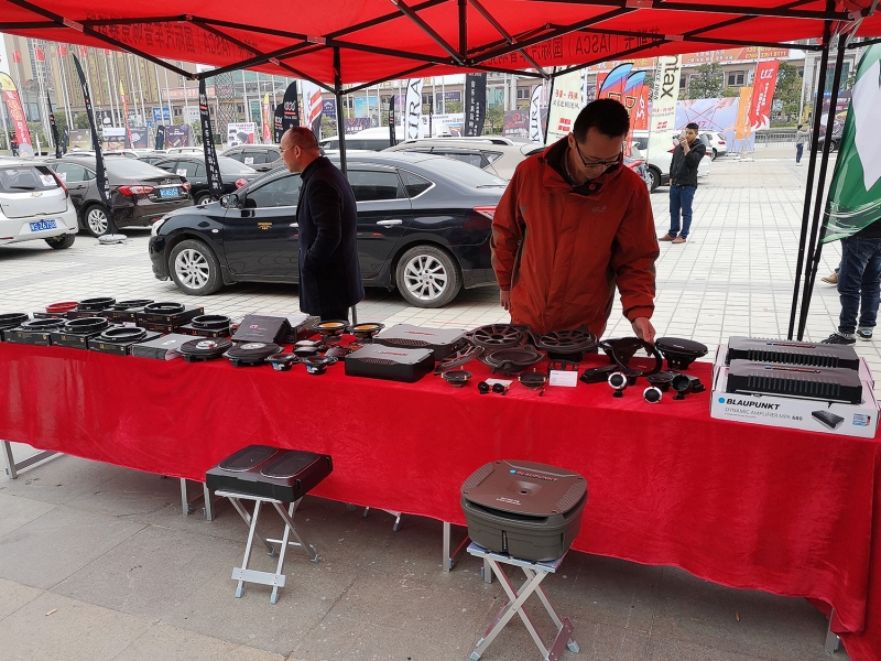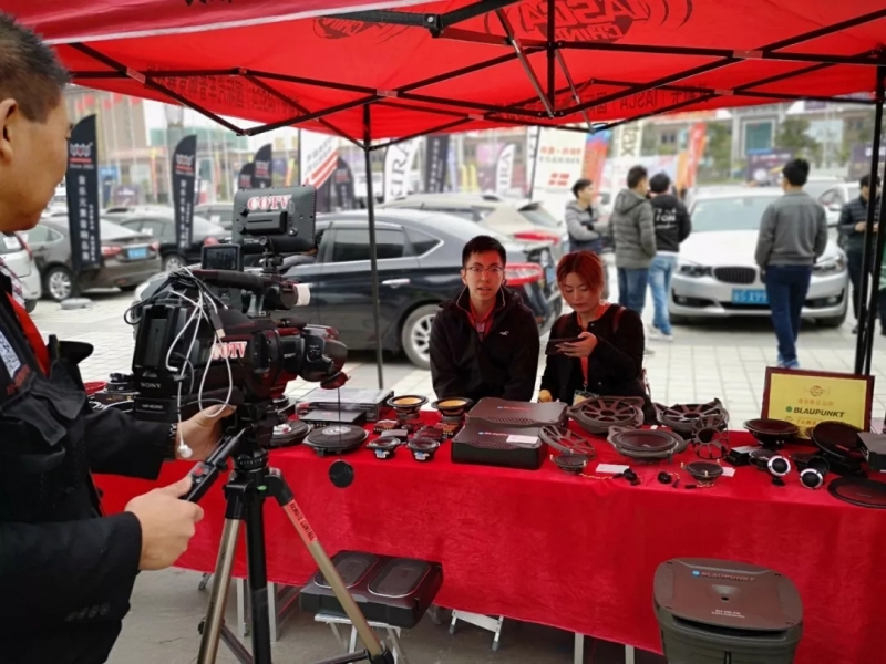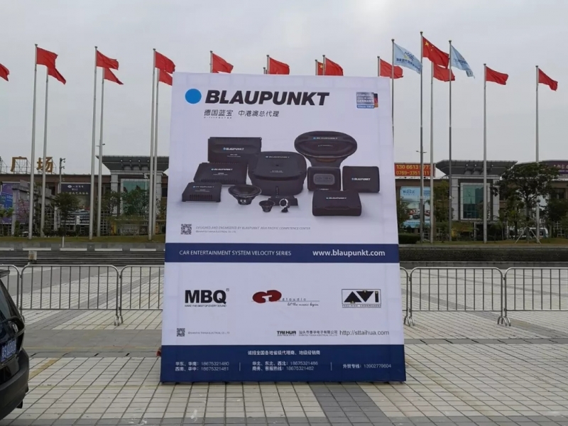 汕頭市泰華電子有限公司的展區(qū)上擺放瞭該旂下所代理的其中兩款汽車音響品牌: 德國(guó)藍(lán)寶(BLAUPUNKT)、美國(guó)西迪聲(CDT) 。